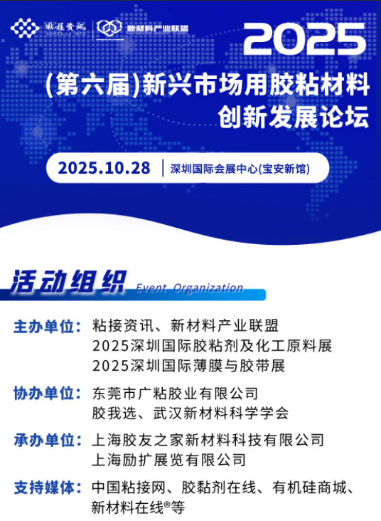 “2025(第六届)新兴市场用胶粘材料创新发展论坛”于2025年10月28日在深圳国际会展中心(宝安新馆)举办,此次会议重点聚焦新能源、新型显示、高端电子等新兴市场用胶技术创新研讨。